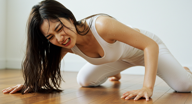 タイトなヨガ服に包まれた彼女は、羞恥と不安で足が震えていた。