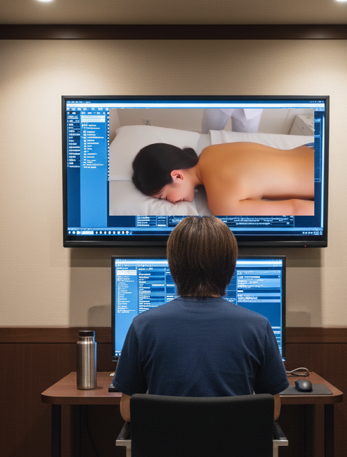 エキゾチカ店舗Aの配信を、秋山は雑居ビルのテレクラVIPルームでモニター越しに監視する。