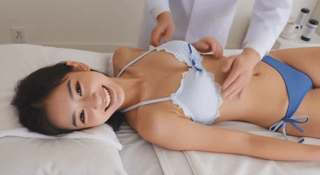 彼女は震える手でスカイブルーのビキニのブラを着け直し、ベッドに仰向けになる。