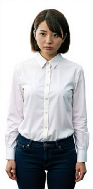 ショートカットの髪、強い眼差し、シンプルでカジュアルな服装。